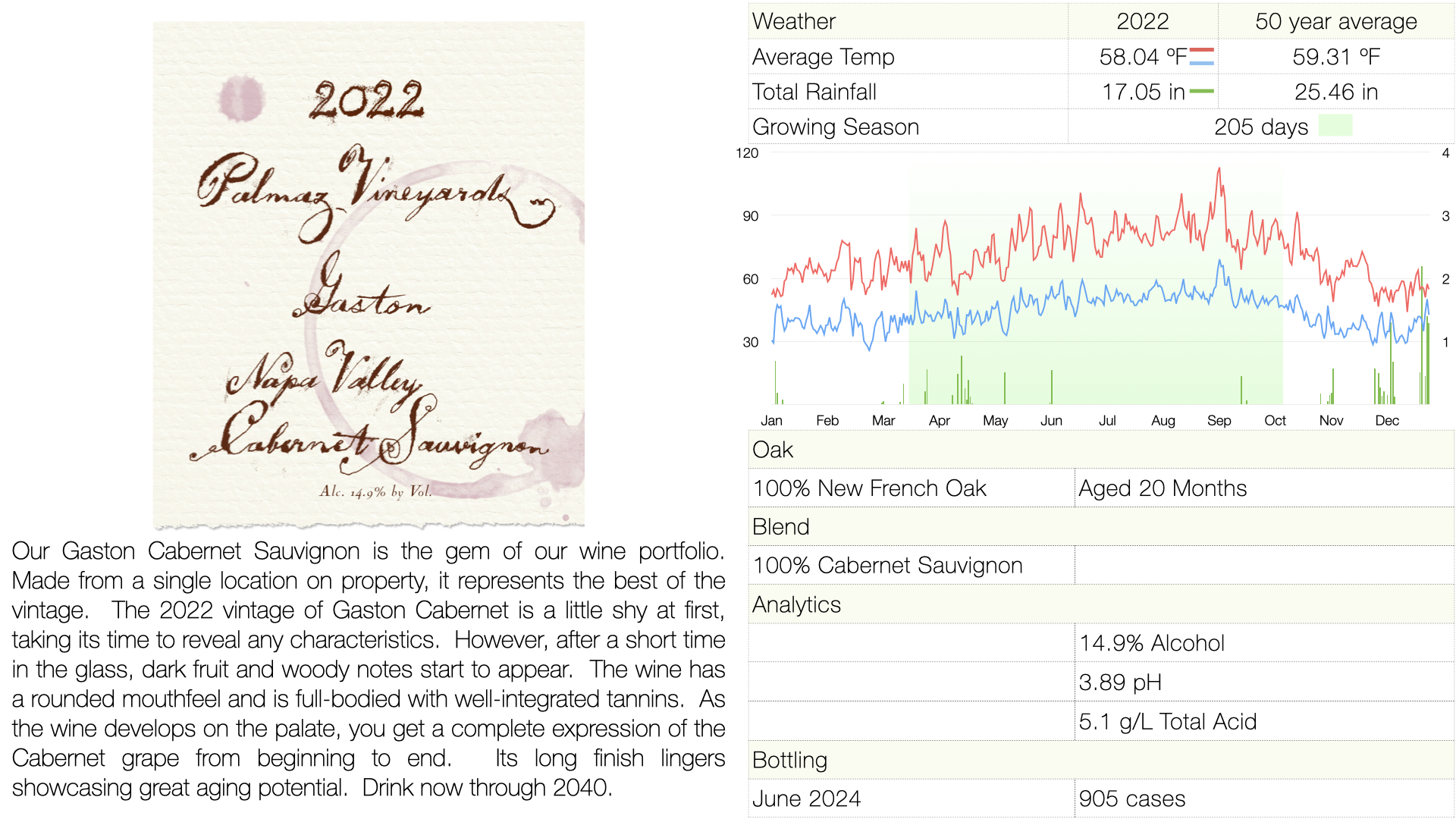 Our Gaston Cabernet Sauvignon is the gem of our wine portfolio. Made from a single location on property, it represents the best of the vintage. The 2022 vintage of Gaston Cabernet is a little shy at first, taking its time to reveal any characteristics. However, after a short time in the glass, dark fruit and woody notes start to appear. The wine has a rounded mouthfeel and is full-bodied with well-integrated tannins. As the wine develops on the palate, you get a complete expression of the Cabernet grape from beginning to end. Its long finish lingers showcasing great aging potential. Drink now through 2040.