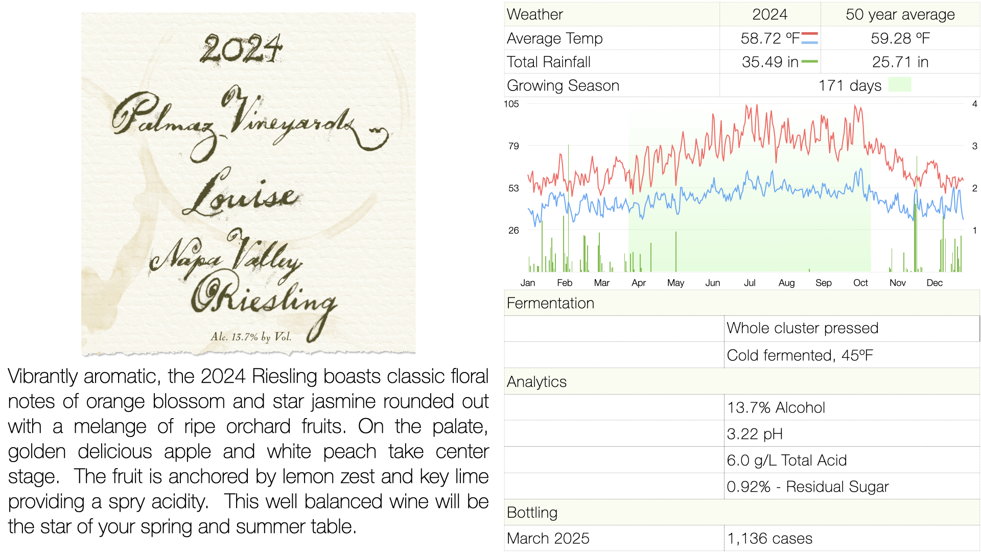 Vibrantly aromatic, the 2024 Riesling boasts classic floral notes of orange blossom and star jasmine rounded out with a melange of ripe orchard fruits. On the palate, golden delicious apple and white peach take center stage. The fruit is anchored by lemon zest and key lime providing a spry acidity. This well balanced wine will be the star of your spring and summer table.
